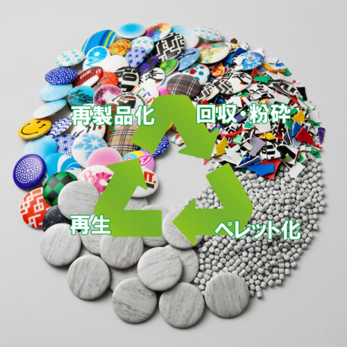 本取り組みでは、大会で販売したオリジナルゼッケン留めのうち、余剰在庫になってしまった物や、製造過程で生じた規格外品を回収し、粉砕処理したのちに、ペレット状に再資源化。